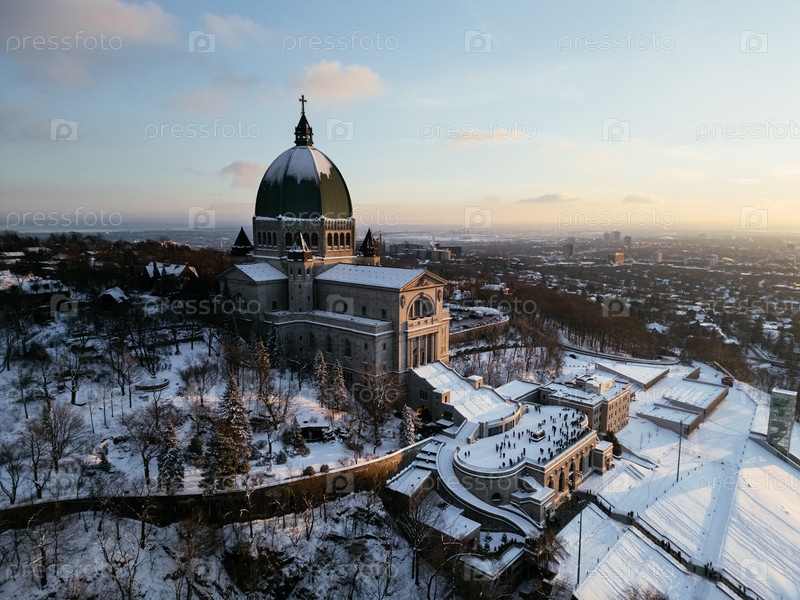 Вид с воздуха Оратория Святого Иосифа на горе Королевской во время захода солнца зимой.Монреаль, Квебек, Канада