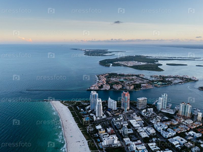 Вид из воздуха Майами-Бич сверху на закате солнца, Южный Бич, штат Флорида, США