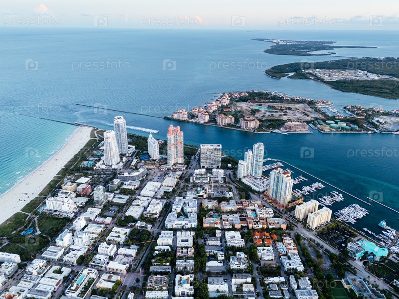 Вид из воздуха Майами-Бич сверху на закате солнца, Южный Бич, штат Флорида, США