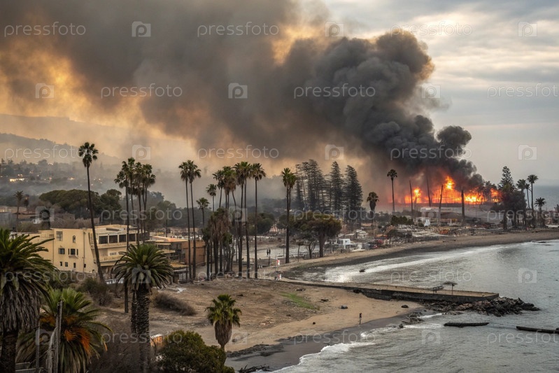 Экологическая катастрофа, пожар в городе у океана с пальмами