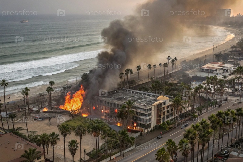 Экологическая катастрофа, пожар в городе у океана с пальмами