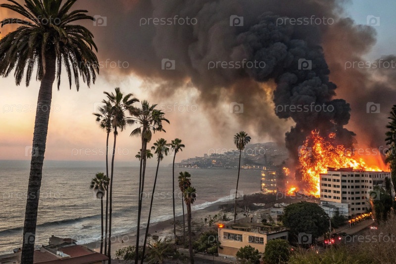 Экологическая катастрофа, пожар в городе у океана с пальмами