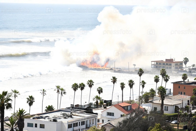 Экологическая катастрофа, пожар в городе у океана с пальмами