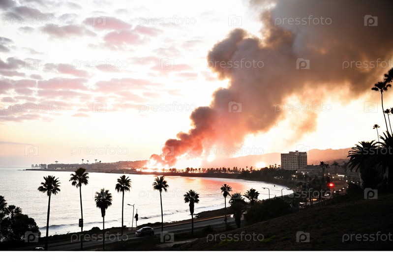 Экологическая катастрофа, пожар в городе у океана с пальмами