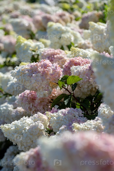 Вид на красивые цветы над цветущим кустом в городском парке в солнечный летний день