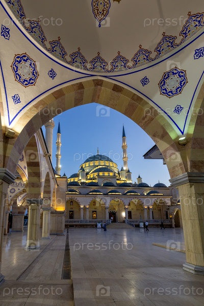Широкий вид двора мечети Ахмеда Кадырова (официально известной как Сердце Чечни) в Грозном при вечернем освещении на закате, Чеченская Республика, Северный Кавказ, Россия