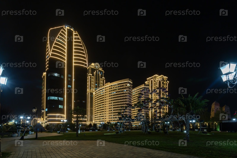 Вид на цветочный парк перед освещенными современными небоскребами Грозного городского комплекса, расположенных вдоль проспекта Ахмата Кадырова, поездка в Чеченскую Республику, Северный Кавказ, Россия