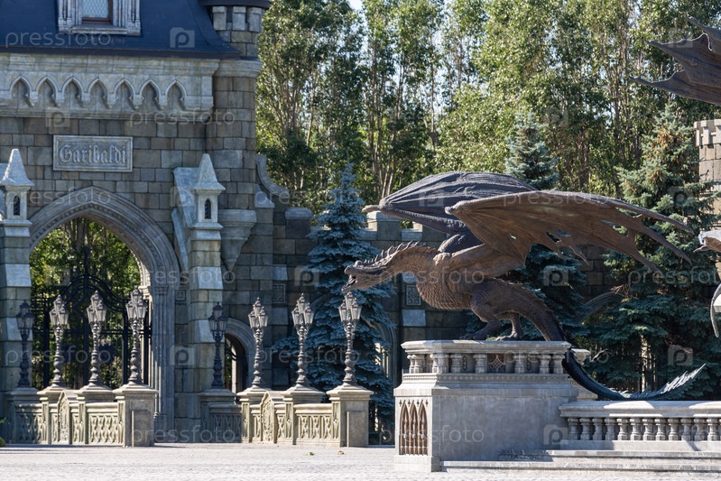 ХРЯШЕВКА ВЕЛАЖА, САМАРСКИЙ РЕГИОН, Россия - 1 августа 2023 года: бронзовая статуя дракона перед входом в комплекс замка Гарибальди, Самараская область, Россия. летние каникулы