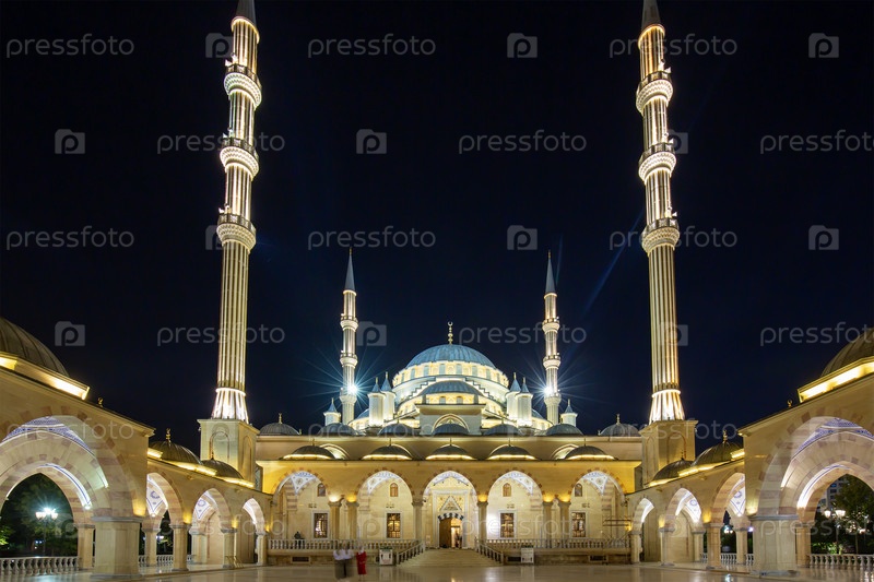 Прекрасный вид на двор мечети Ахмеда Кадырова (официально известная как Сердце Чечни) в Грозном с вечерним освещением ночью, Чеченская Республика, Северный Кавказ, Россия