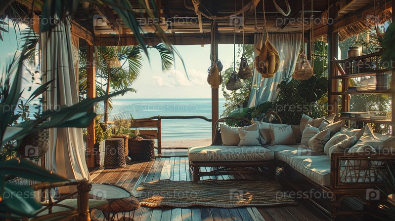 Красивая пляжная интерьерная сцена из роскошных номеров у моря.Отдых, отдых, природа