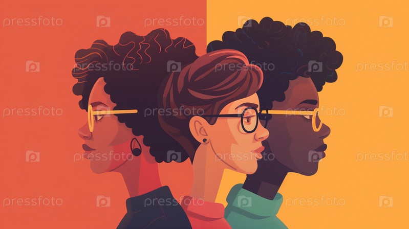 Три женщины в профиле носят очки на желто-оранжевом фоне.Концепция эмпатии и расового равенства