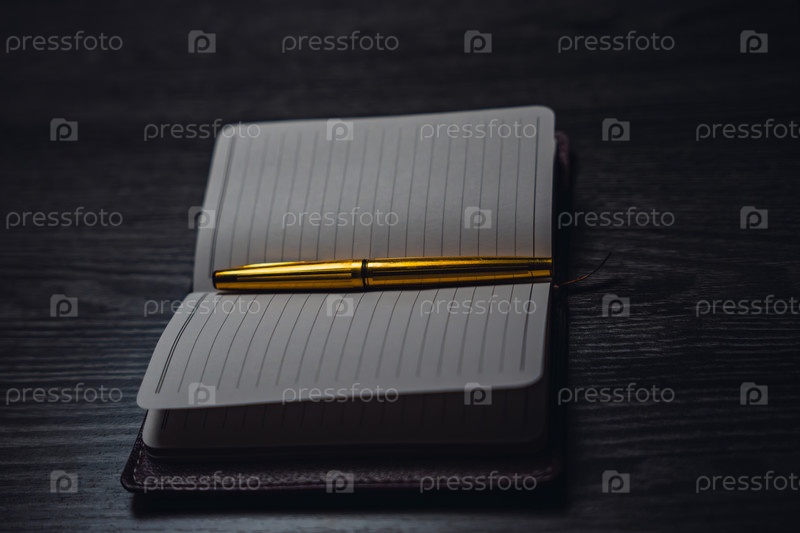 Ноутбук с золотой ручкой на столе при свечах