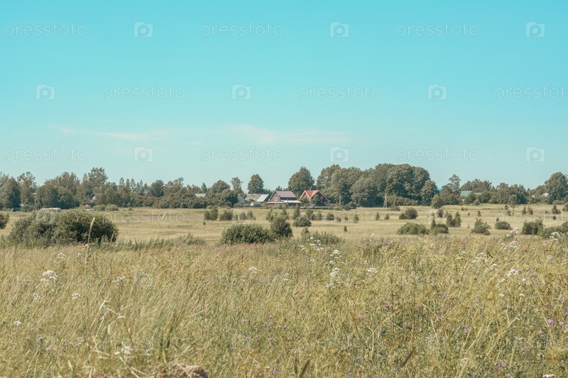 Загородный луг с отдаленными домами под чистым голубым небом