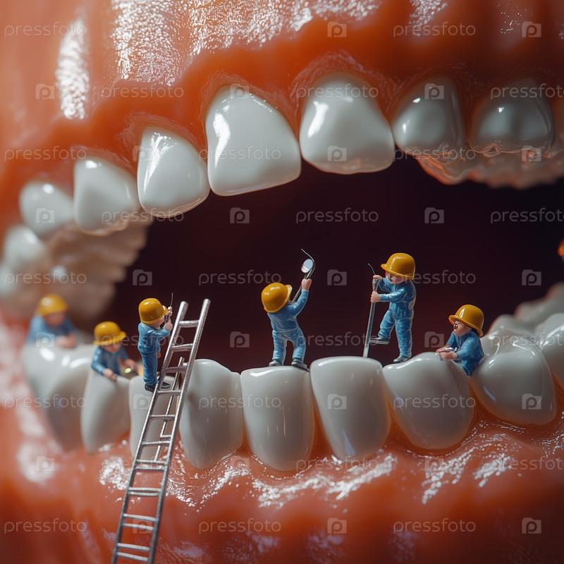 Работники миниатюры чистят гигантские зубы в сюрреалистической концепции