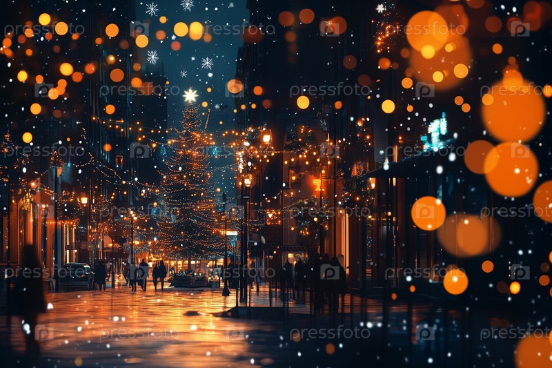 Улица праздничного города с яркими огнями и снегом