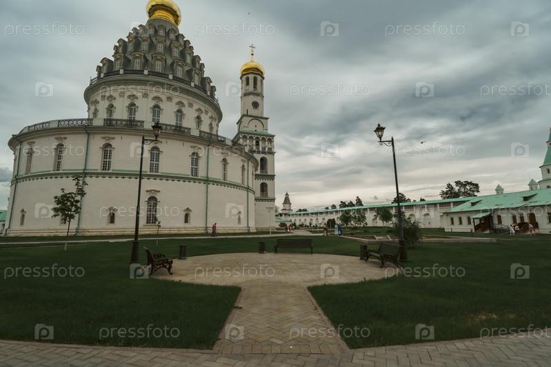 Двор с скамейками возле исторического круглого здания. воскресенье Новый Иерусалимский монастырь