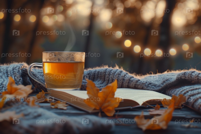 Открытая книга и горячий чай в уютный осенний вечер