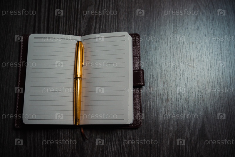 Ноутбук с золотой ручкой на столе при свечах