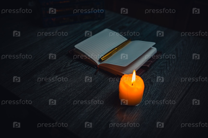 Ноутбук с золотой ручкой на столе при свечах