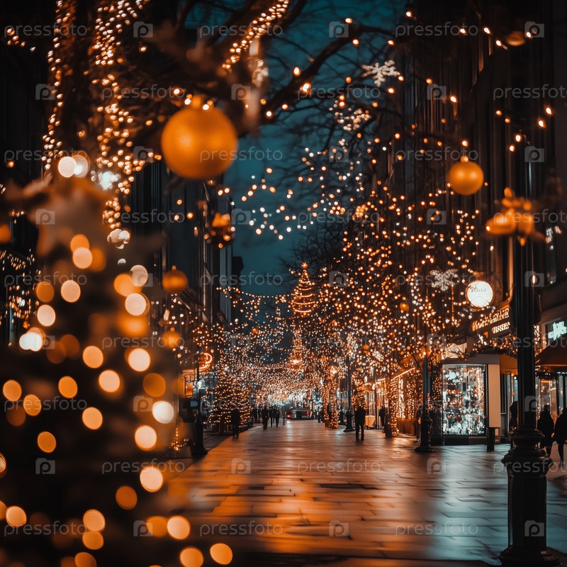 Улица праздничного города с рождественскими огнями ночью