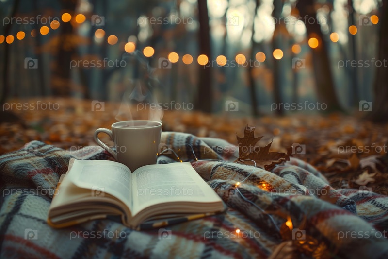 Открытая книга и горячий чай в уютный осенний вечер