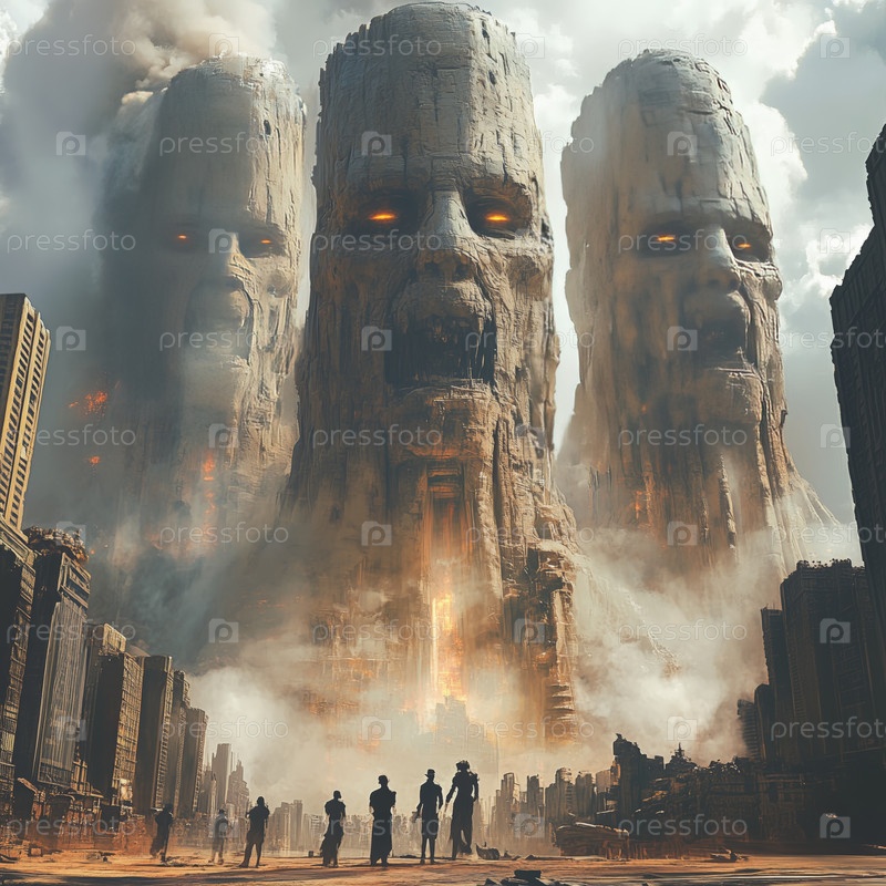 Колоссальные каменные лица, выходящие из земли в городе