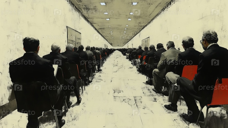 Абстрактная сцена мужчин в костюмах, сидящих в суровом коридоре
