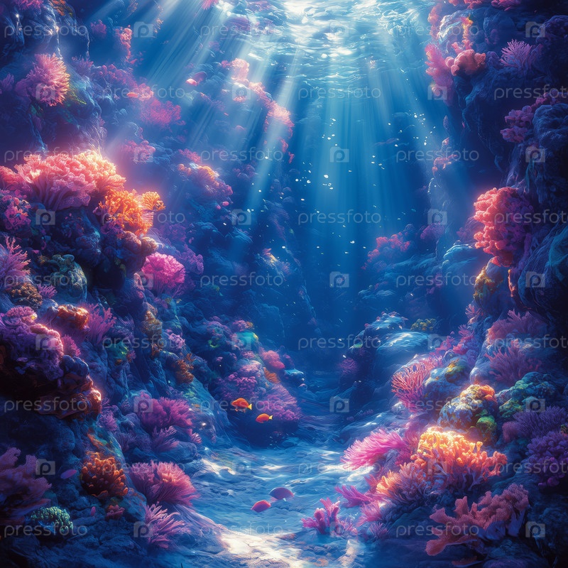 Красочный подводный коралловый риф с солнечным светом и тропическими рыбами