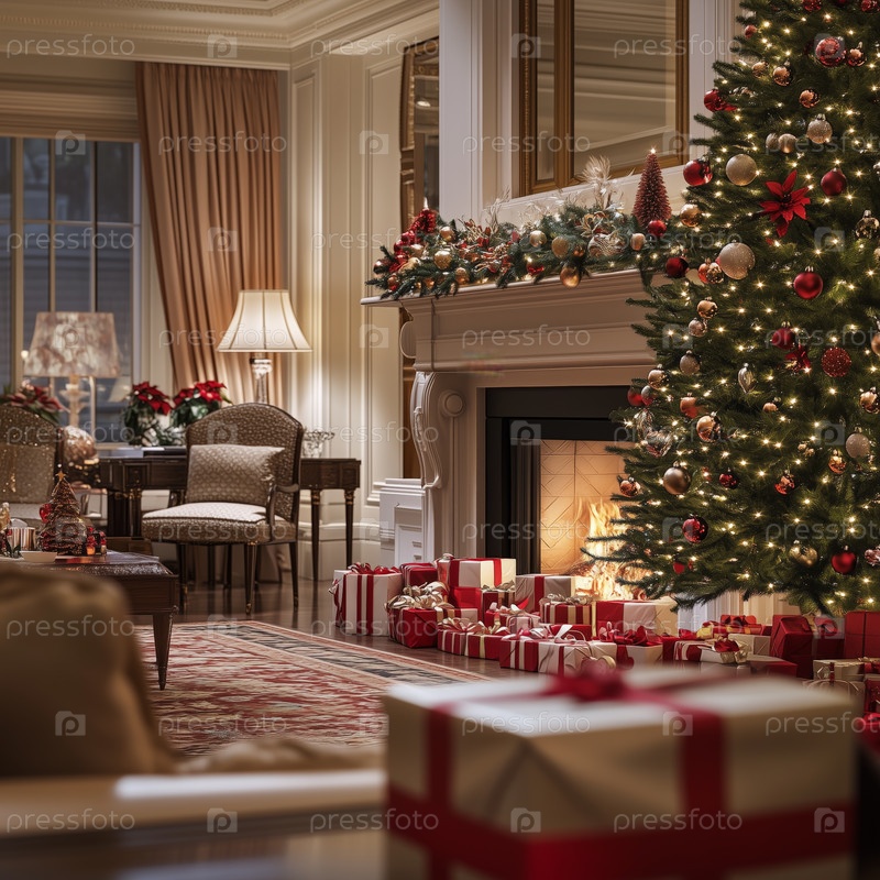 Элегантная гостиная, украшенная камином и деревом на Рождество