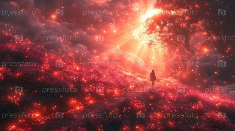Сюрреалистическая светящаяся лесная тропа с человеком, идущим в яркий свет