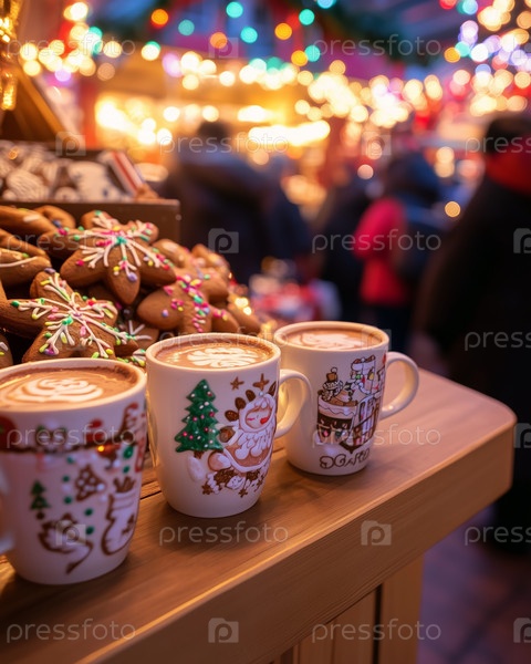 Праздничные кружки горячего шоколада с печеньевыми печеньями на рождественском рынке