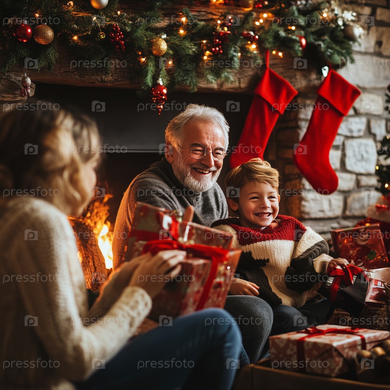 Семья обменивается подарками у камина в канун Рождества