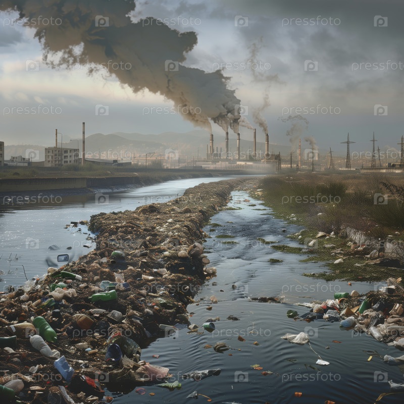 Загрязненная река с промышленным фоном и мусором