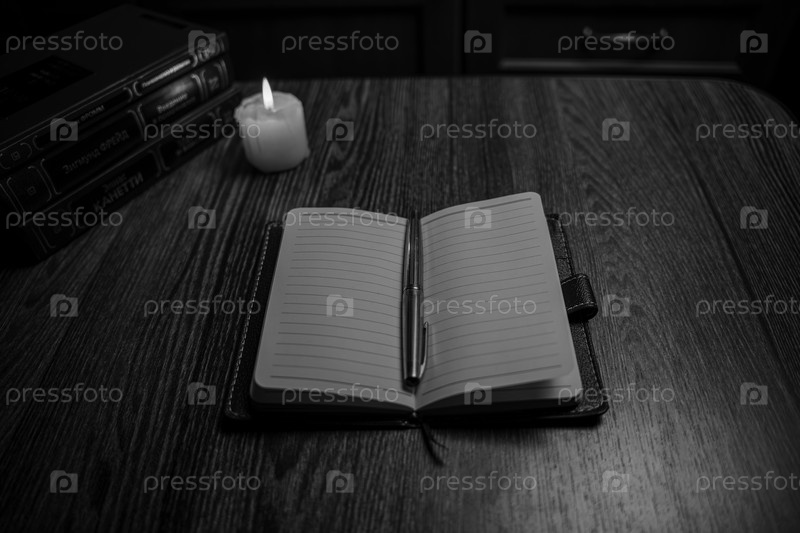 Черно-белая фотография - блокнот с ручкой на деревянном столе Бизнес, финансы и творчество Рабочее место