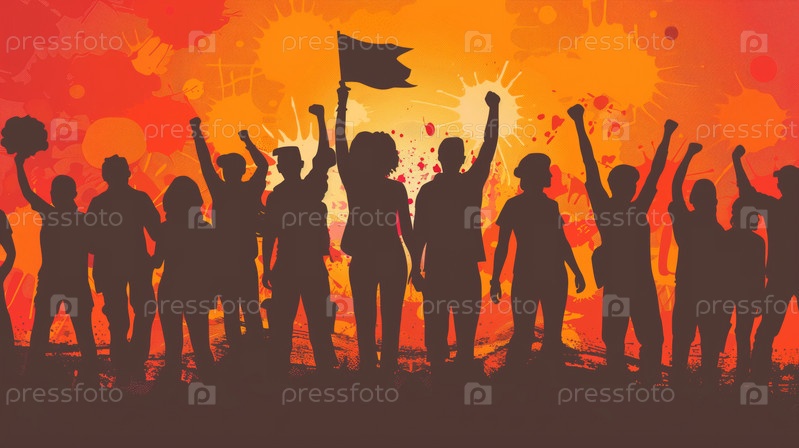Активисты маршируют во время заката с поднятым кулаком