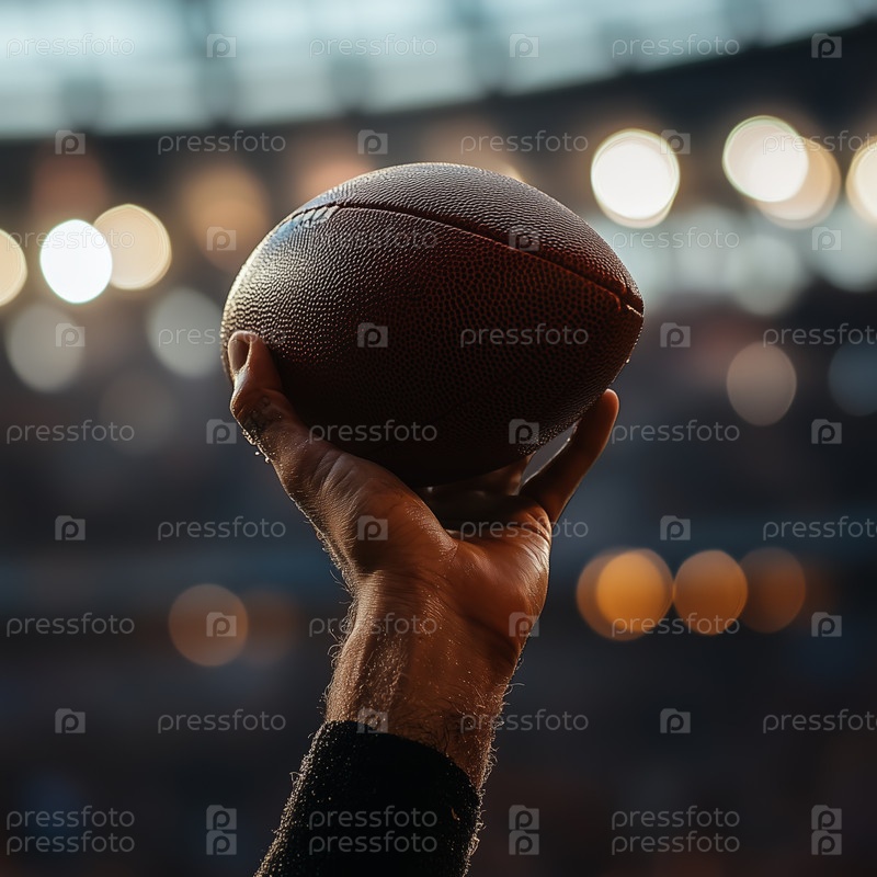 Рука, держащая футбол на освещенном стадионе ночью