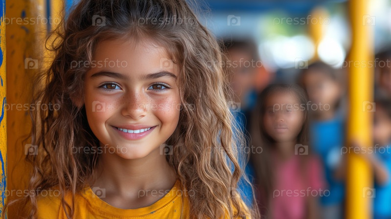 Улыбающаяся девушка, стоящая у красочного столба в групповой активности