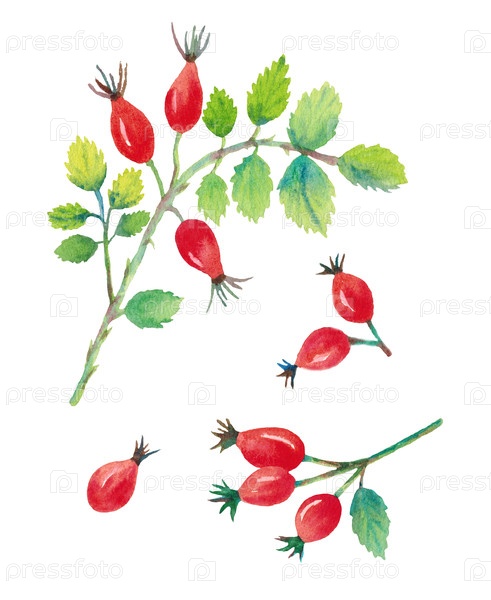 Окрашенная в акварель ветвь розового косточка с фруктами