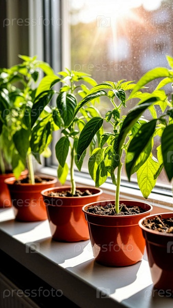 Посадка помидоров крупным планом на подоконнике под ярким солнечным светом