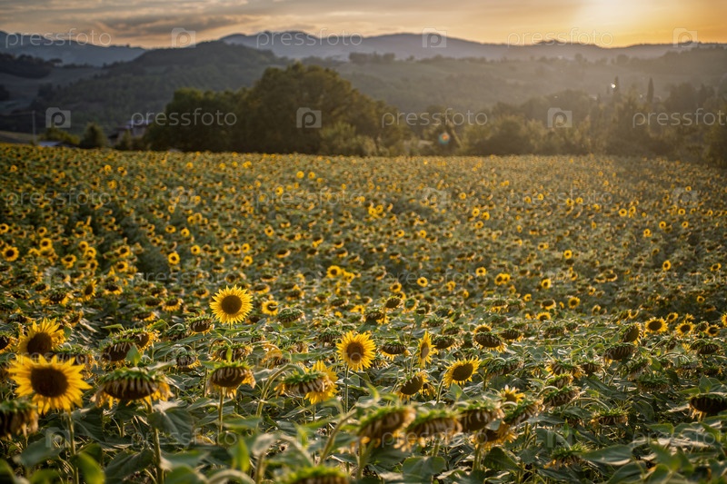 Подсолнечник в поле на фоне итальянских гор при закате