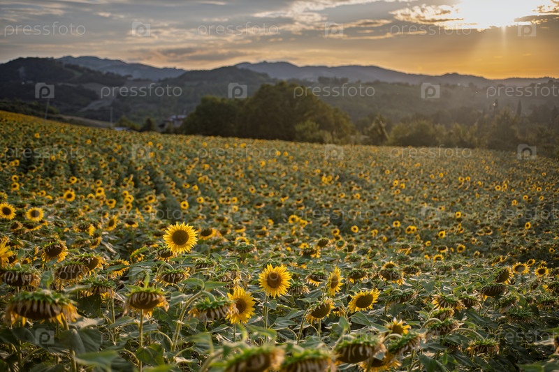 Подсолнечник в поле на фоне итальянских гор при закате