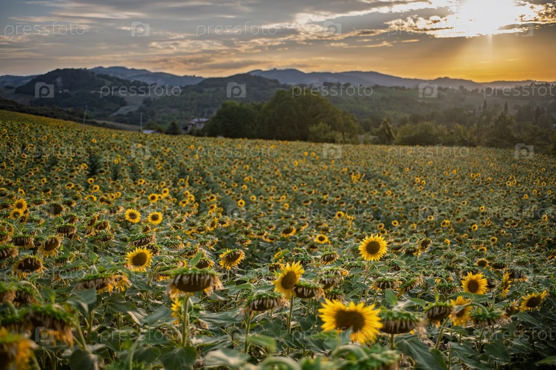 Подсолнечник в поле на фоне итальянских гор при закате