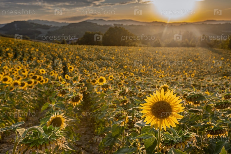 Подсолнечник в поле на фоне итальянских гор при закате