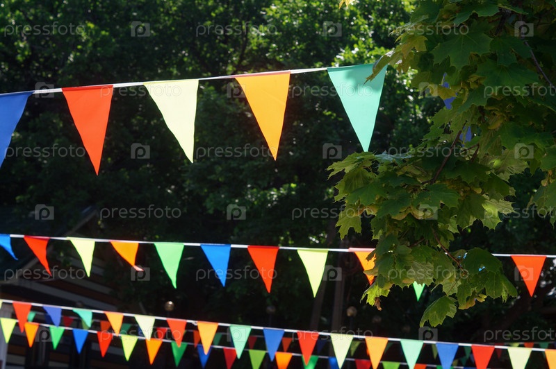 Гирлянда многоцветных треугольных флагов на фоне зеленых деревьев