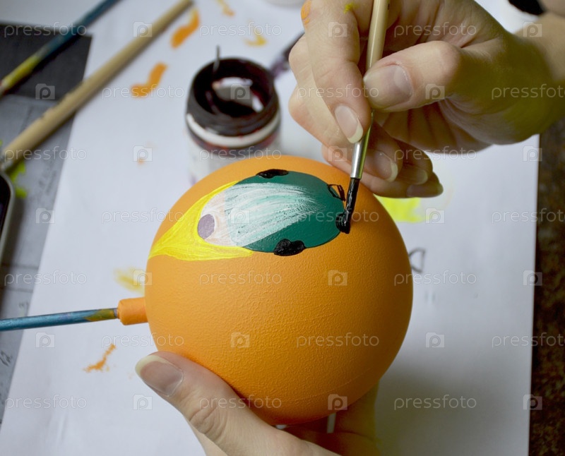 Женские руки тщательно рисуют ярко окрашенный рождественский шар: с помощью кисти они нарисовали силуэт карлика с полной бородой на его поверхности, создавая сказочный персонаж