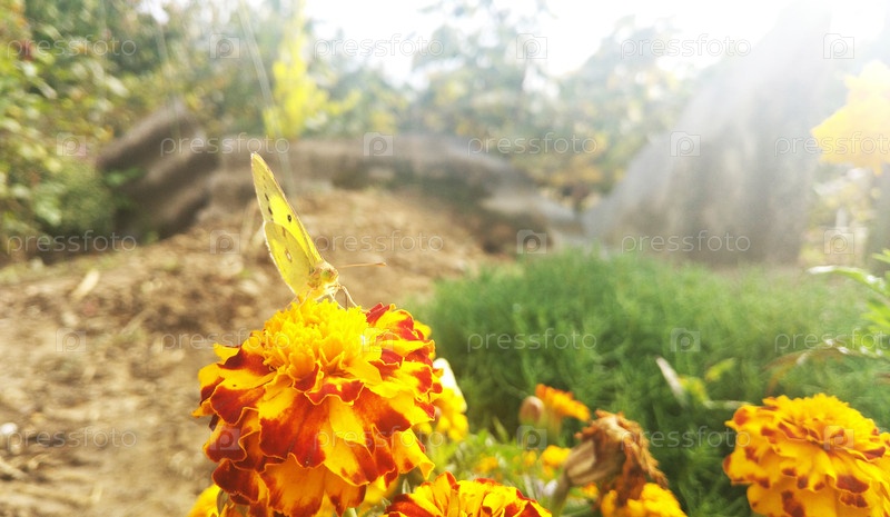Желтая бабочка сидела на ярком цвете календулы или маригольде, все освещенное ярким солнечным светом.Атмосфера теплая, солнечная и естественная, подчеркивая хрупкую красоту момента