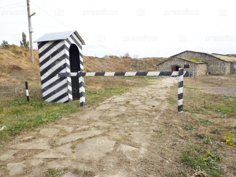 Дом охраны, окрашенный в черно-белые полосы. Он выглядит пустым и наклонным. Перед стендом находится простой деревянный барьер, также окрашенный в чёрно-белые полосы. Он блокирует узкую каменную тропу