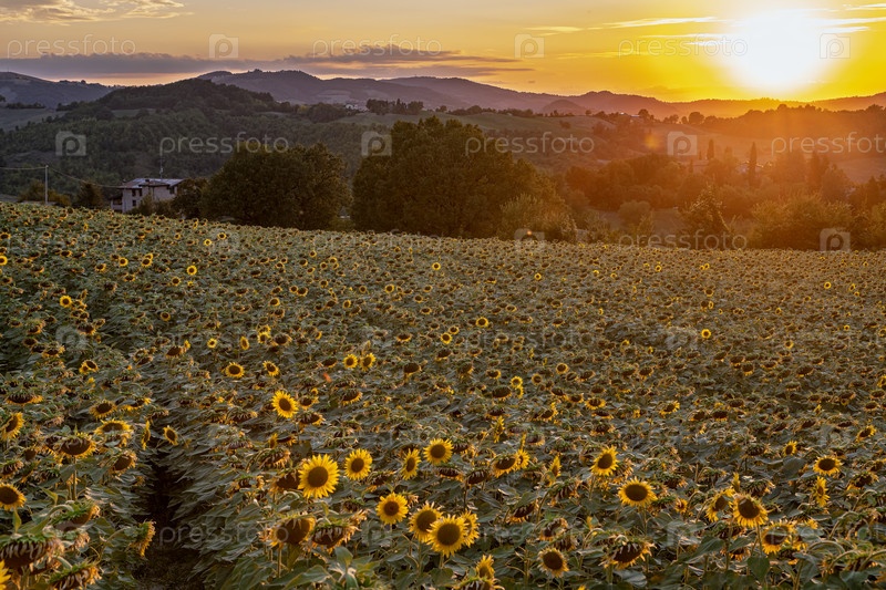 Подсолнечник в поле на фоне итальянских гор при закате