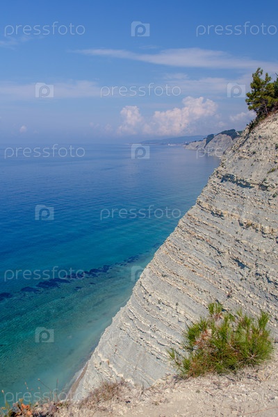 Курорт Геленджик, пляж Сосновка. Черное море. Высокий белый камень, сосны растут сверху. Пляж у основания скалы. Маяк на заднем плане