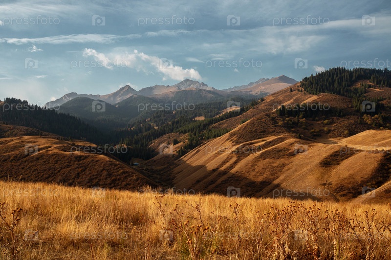 Величественный казахский пейзаж: заснеженные вершины, лесистые холмы и золотые степи в кадре